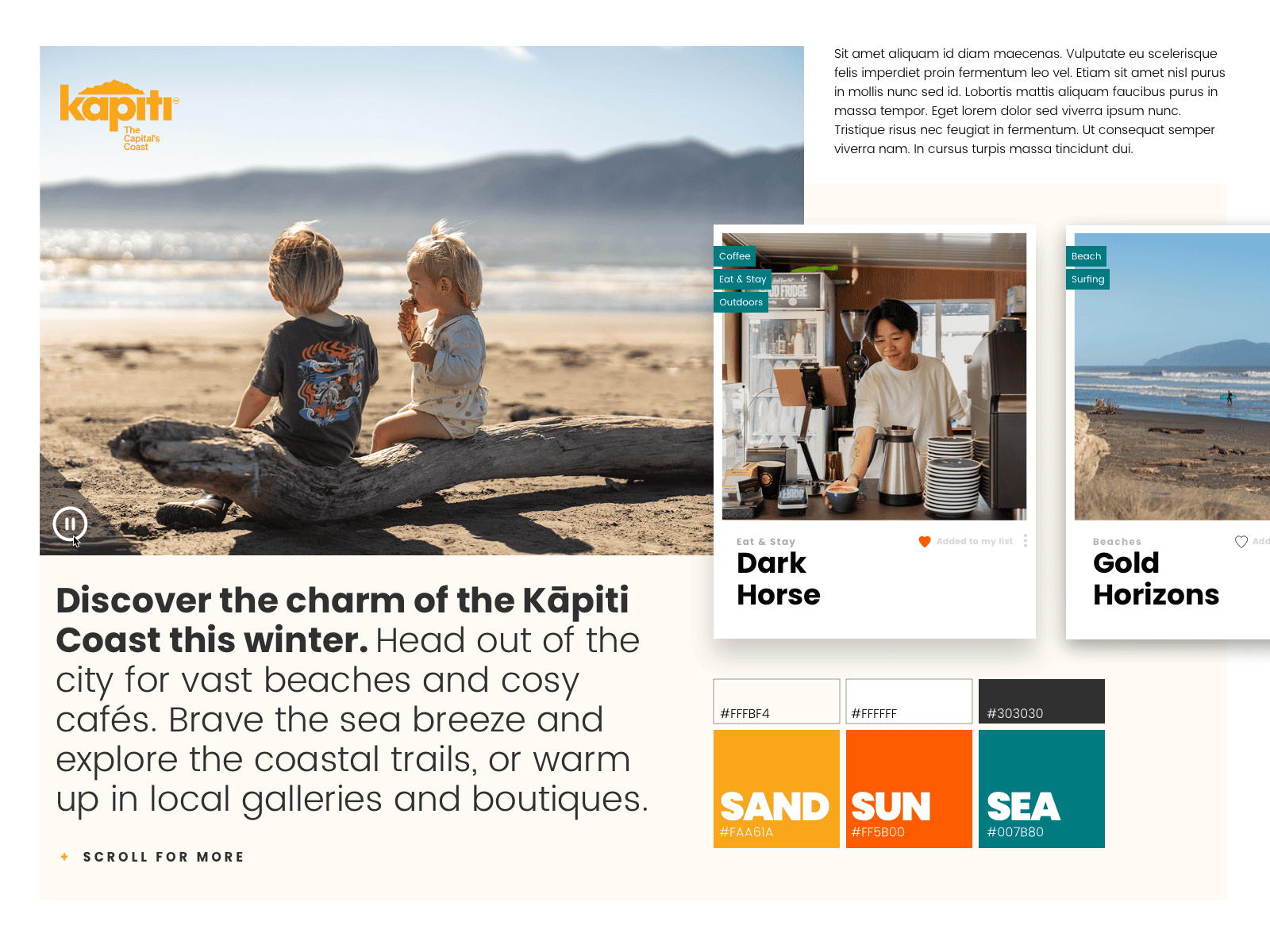 Brand thinking paired with usability research and planning, enable Wonderlab to hit the notes on brand expression and user experience. The final web design’s modularity and energetic contemporary design language, result in a feeling of adventure. The site build also works hard for accessibility, ensuring users of any background can surf it while actively enticed to Visit Kāpiti up on Wellington’s sunshine coast.